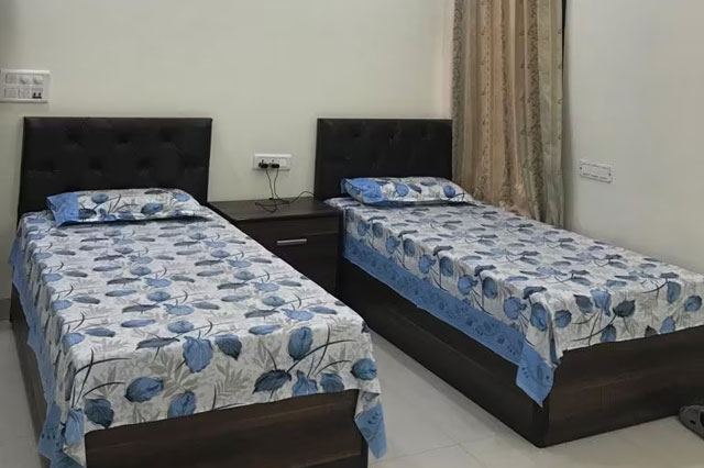 Rooms with one bed, of two seater available with independent entry. Dressing Room, Seprate AC, Bath room, Kitchen, Two almirah, LCD roof Curtains, LCD provision, Fridge, RO, With big court yard with blooming flowers.