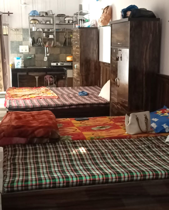One big room with three bed, six seater available. (Rs 3000 for November to March, Rs 2500 for April to October) Attached bathroom, Fridge, RO, Kitchen, Cooler, with almirah. Front big courtyard decorated with blooming flower. Independent entry.